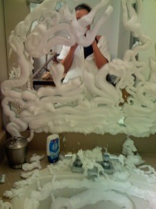 I don’t even remember how I realized what was going on, but I do remember going upstairs and seeing my bed linens strewn all over the hall on the third floor (I was on the second floor). Cue instant screaming. I’m talking like Regina George style in Mean Girls. This helped to get everyone more excited because it marked that I realized what was going on. I make my way downstairs to my entire room toliet papered and shaving creamed – not to mention a gaggle of Thetas were outside watching and smiling. Out of consideration they shut my computer before demolishing my desk with shaving cream – however, they didn’t know that if you closed my computer it would completely shut off and would not under any circumstance recover any documents, or say, massive papers due the next day.