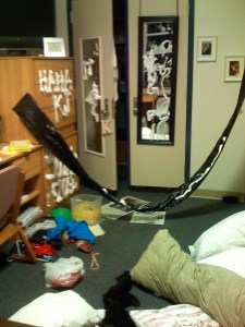 SO, we’re all sitting in the meeting not doing much of anything. I’m wondering out loud if we can leave because I was in the middle of writing three separate papers and all that jazz. Little did I know that when I walked out of Katelin’s room that all hell had broken loose in the Thouse. I’m pretty sure every girl living there had recruited a friend or boyfriend to help play the most massive trick possible.