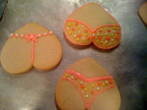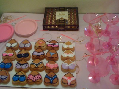 Let’s backtrack.  Once I got into town on Friday, I started to decide on decor and all of that jazz.  I hit up Hobby Lobby and found FABULOUS things that were all inexpensive and adorable; I grabbed martini glasses as Party City for super cheap.  I spent hours upon hours baking cupcakes and cookies into the shape of hearts to create little thongs and bras for everyone.  As my brother said as he walked into the kitchen, “Um, do you mind me asking why you’re making cookies that look like g-strings?”  Just another typical Friday night.