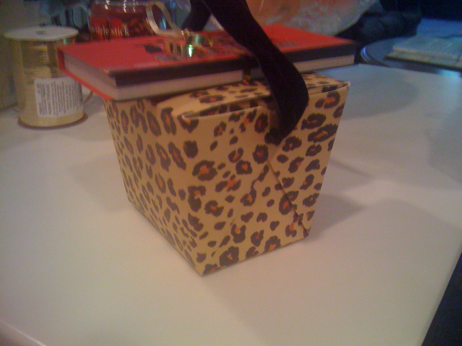 Here’s the take-out box I used for the bride’s gift.  Inside I put one of her gifts (a white and baby blue garter — in hopes she’ll use it as her “something blue”) and since her other gift didn’t quite fit, I wrapped gold ribbon around it.