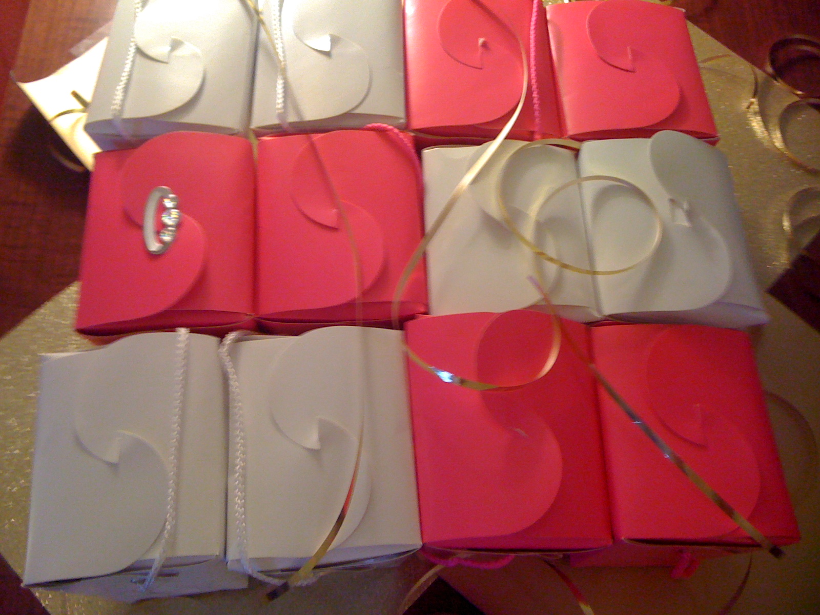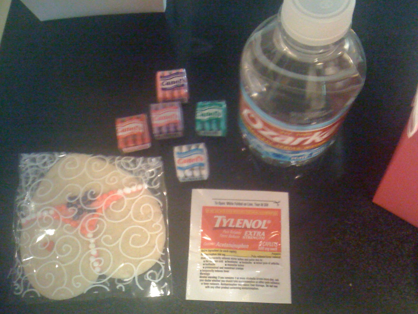 It’s not necessary, but I decided to make some fun favors for the group.  It was really simple and fun to do!  I grabbed some really cute take-out boxes from Hobby Lobby in pink and white.  Take out boxes are great because they look good and they’re pretty inexpensive as well.  In the boxes, I put some essentials for the night ahead: gum, a mini bottle of water, an individual pack of Tylenol and one of the homemade panty/bra cookies, which I put in a cute little bag.