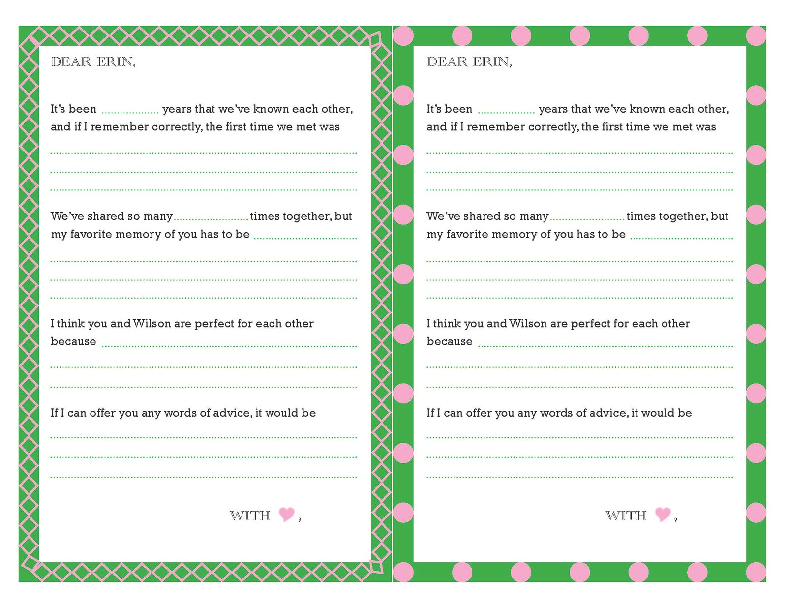 • I didn’t get time to do this either, but it’s so cute!  I created this on InDesign and is great for a memory book for the bride.  Have everyone fill out the page below — it gets conversation going for sure!