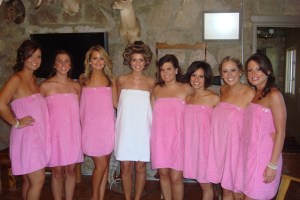 After promising to go to bed at 10:00 and staying up until 2:00 a.m., we woke up on Saturday ready to take on Erin’s wedding day. Most of the bridal party got their hair done professionally, but I never look good with an up-do so I opted to leave my hair down. We all wore our bridal wraps that Erin gave us at the luncheon and chatted about the day’s upcoming festivities. Erin looked calm and she was literally glowing the whole day.