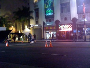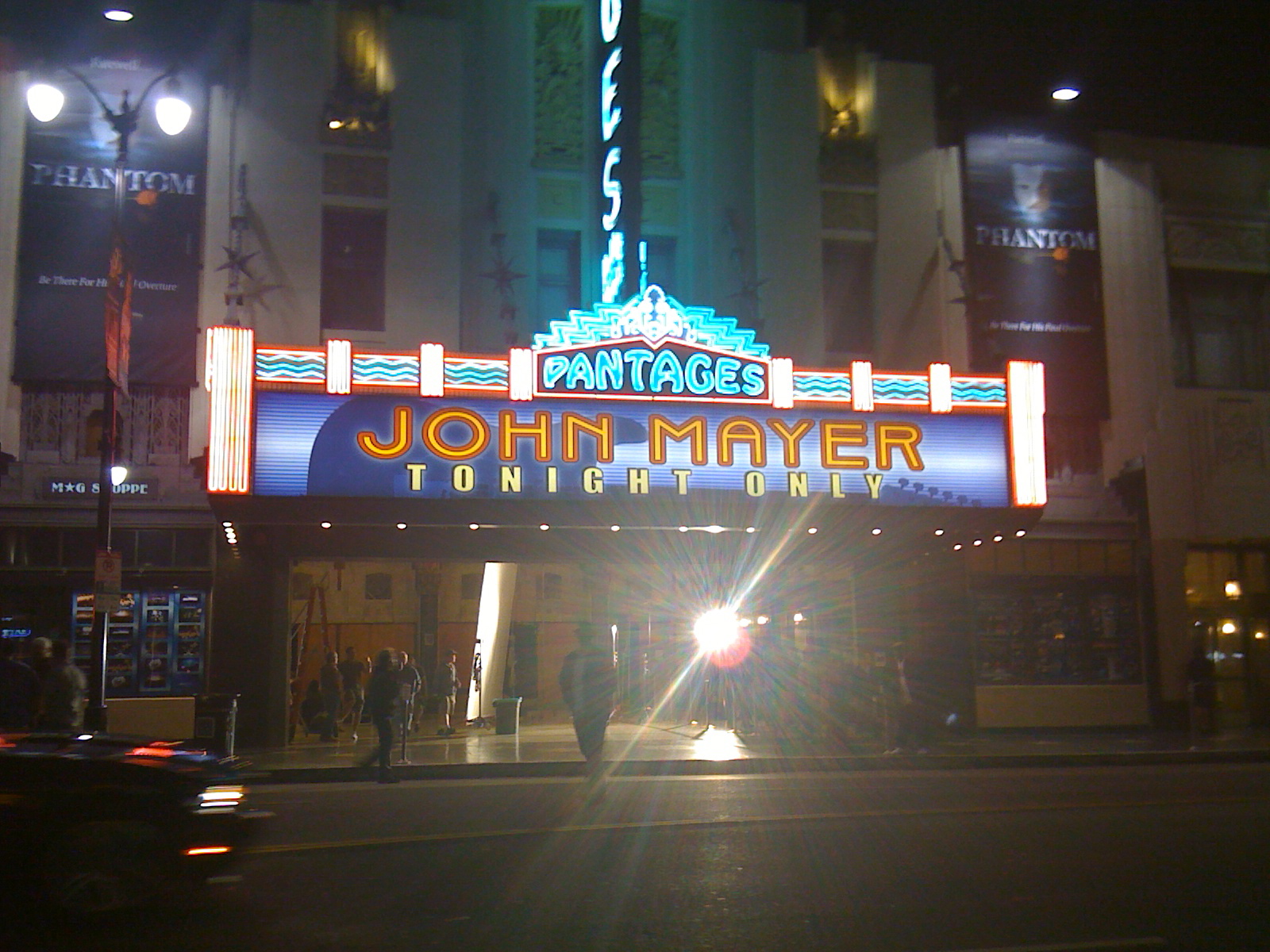 So, we turn left on Vine and pull up to a stop light at Hollywood Boulevard when we notice a ton of film equipment. Upon further investigation, we also noticed (well, we couldn’t miss it really) the gigantic “JOHN MAYER, TONIGHT ONLY” sign that was up at the Pantages Theater. There were a bunch of stand-up signs that I couldn’t read, but I was literally squealing: JOHN MAYER! I missed his concerts in LA this year and I was pretty bummed out about it, so perhaps he was doing some kind of random-concert to film for a DVD or for Jimmy Kimmel or something. I didn’t know and didn’t care, but we needed to get there.