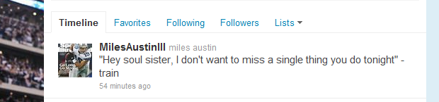 Oh Miles Austin. Not only are you 100% Grade A babe meat, you’re also in tune with your feminine side. Gotta love a man who gets down to Train.